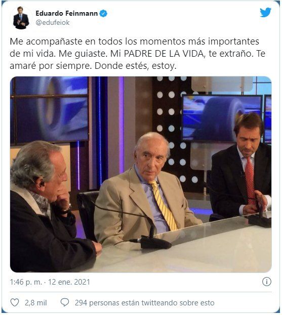 A modo de promesa y homenaje, el periodista Eduardo Feinmann cerró su mensaje con el más profundo pesar. "Mi padre de la vida, te extraño. Te amaré por siempre. Donde estés, estoy", expresó.