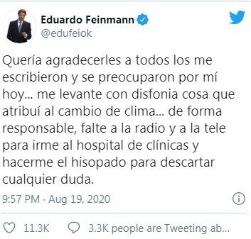 Según la información que publicó el medio, el periodista permanecerá interno hasta que se controle la temperatura y con el fin de evitar complicaciones. “Quería agradecerles a todos los que me escribieron y se preocuparon por mí. Hoy me levanté con disfonía, cosa que atribuí al cambio de clima", fue parte del mensaje que publicó el conductor de Radio Rivadavia.