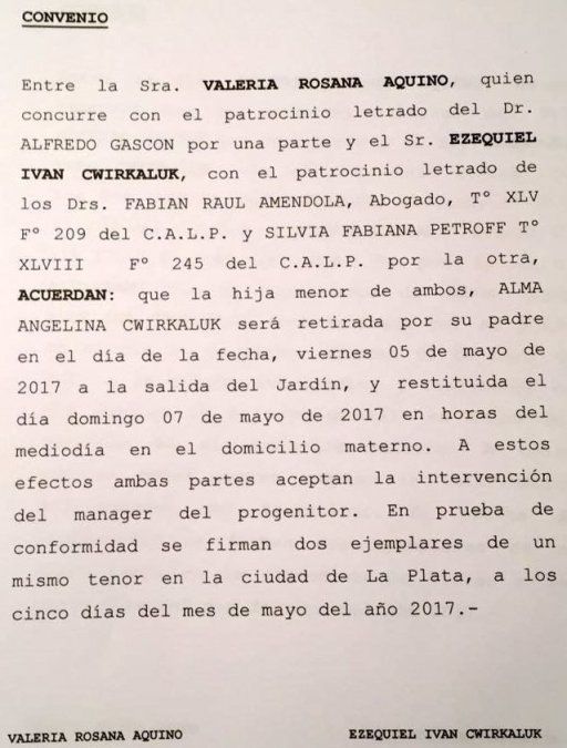 Como así también de las amenazas que ella denuncia haber recibido en los últimos tiempos. Puede verse el convenio al que ambos arribaron para que El Polaco tenga la guarda de la pequeña Alma este fin de semana, según puede verse en las fotos que acompañan esta nota.