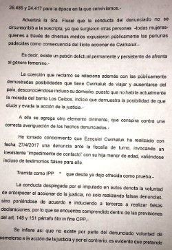 Según la defensa de Aquino, existe en la conducta del cantante "un patrón delincuencial y persistente de afrenta al género femenino". El expediente aclara que no pudieron realizarse las pericias sobre Ezequiel Cwirkaluk por no tener domicilio fijado.