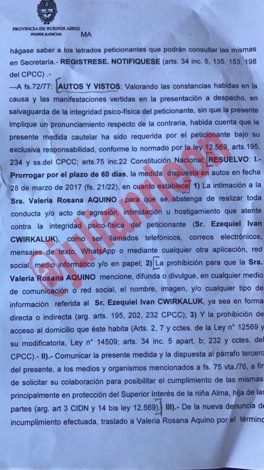 "La prohibición para que la Sra.Valeria Rosana Aquino, mencione, difunda o divulgue en cualquier medio de comunicación o red social, el nombre, imagen, y/o cualquier tipo de información referida al Sr Ezequiel Iván Cwirlakuk (el Polaco) ya sea en forma directa o indirecta", con esta resolución la ex del cantante quedó legalmente impedida de seguir contando, según sus palabras, su historia de violencia que padeció hasta hace poco con el padre de su hija.