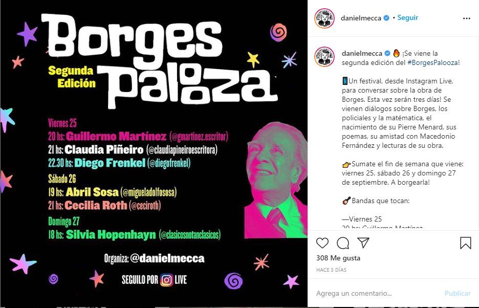La iniciativa busca aproximar a los jóvenes a la obra del escritor Jorge Luís Borges y trata de pensarlo detrás del "mito Borges", apunta a eludir la lectura erudita, lejana e inalcanzable de su obra. El BorgesPalooza se transmitirá desde la cuenta Instagram de Daniel Mecca.