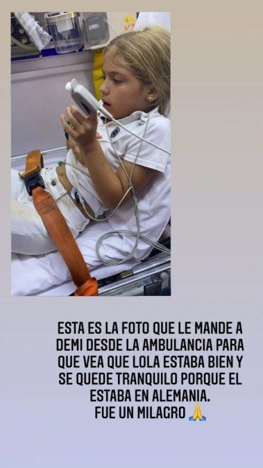 En otra de las publciaciones que hizo Anderson, la nena de 7 años aparece dentro de la ambulancia y contó que esta fue la imagen que le hizo llegar a su padre. “Esta es la foto que le mandé a Demi desde la ambulancia para que vea que Lola estaba bien y se quede tranquilo porque él estaba en Alemania. Fue un milagro”, contó sobre el susto que pasaron.