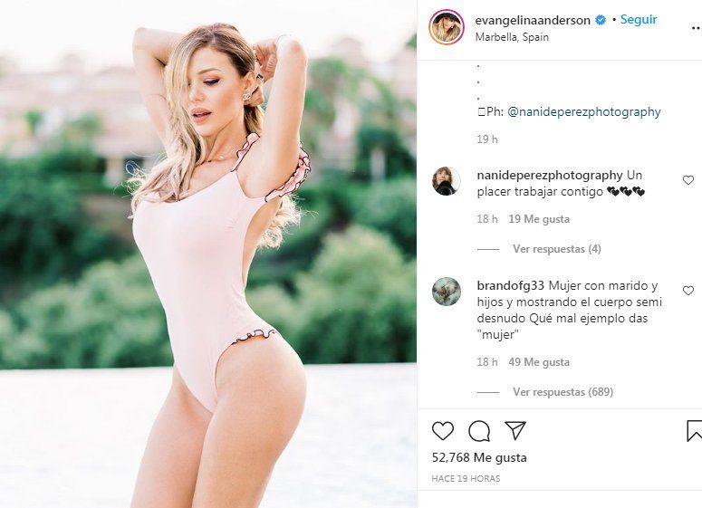 “Mujer con marido e hijos y mostrando el cuerpo semidesnudo. Que mal ejemplo das, ‘mujer’”, fue el comentario al que Anderson respondió de manera sarcástica: “Las que estamos casadas y somos madres para ir a la playa deberíamos usar túnicas. Bravo”, escribió en la red social donde la modelo muestra su día a día. Otro comentario, en el mismo tono decía: “ A la señora no le favorece. Es ropa, ya está. Tenés hijas y el cuerpo ya no es el mismo, hay que tapar la parte de abajo”, y también recibió un contundente mensaje por parte de Evangelina que publicó junto a un emoji tapándose la cara.