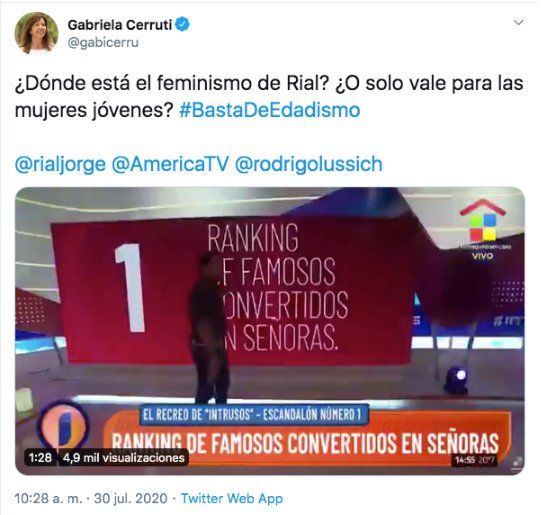 Todo comenzó con la denuncia del INADI (Instituto Nacional contra la Discriminación) a una sección de Intrusos titulada “Famosos con caras de viejas” que suele presentar Rodrigo Lussich. El cuestionamiento realizado por el organismo motivó una crítica de la diputada Gabriela Cerruti a Jorge Rial, a quien le cuestionó su feminismo. “¿Dónde está el feminismo de Rial? ¿O solo vale para las mujeres jóvenes? #BastaDeEdadismo”, escribió Cerruti en Twitter.