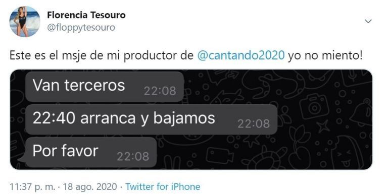 En tal sentido, a través de su cuenta de Twitter, Floppy desmintió esta versión :"Yo no fui a los gritos a ningún lado, le informaron mal @cantando2020", lanzó al mismo tiempo que agregó: "Yo estaba tercera en la grilla tengo los mensajes de la producción si quiere verlos. Yo no pedí cambio".