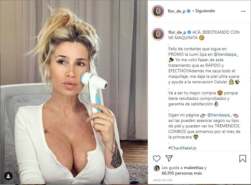 En esta oportunidad la actriz Flor Peña subió una foto en su casa, donde se mostró a cara lavada, haciéndose una limpieza facial con una maquinita, además se vistió con una remera blanca de algodón con un escote.