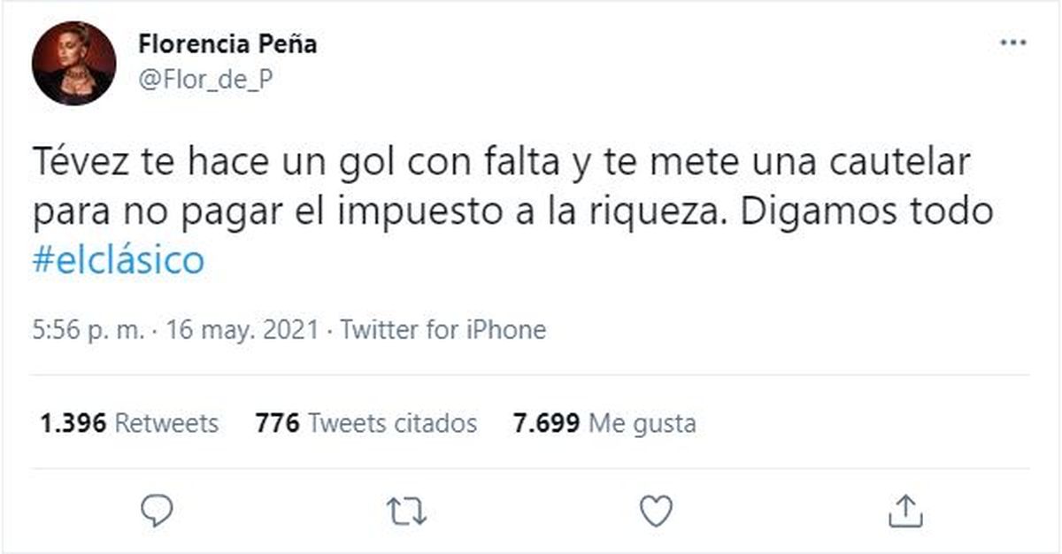 A través de su cuenta en la red social del pajarito, la actriz y presentadora Florencia Peña escribió: “Tevez te hace un gol con falta y te mete una cautelar para no pagar el impuesto a la riqueza. Digamos todo #elclásico”. Tras el tuit de Peña, donde hizo referencia al amparo presentado por Carlos Tevez para no pagar el impuesto a la riqueza, las críticas en contra de la también humorista no se hicieron esperar.