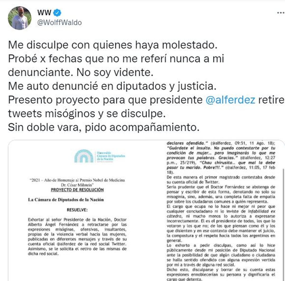 A través de Twitter, el diputado Waldo Wolff escribió: "Me disculpe con quienes haya molestado. Probé x fechas que no me referí nunca a mi denunciante(Florencia Peña) . No soy vidente. Me auto denuncié en diputados y justicia". Además agregó: "Presento proyecto para que presidente @alferdez retire tweets misóginos y se disculpe. Sin doble vara, pido acompañamiento".