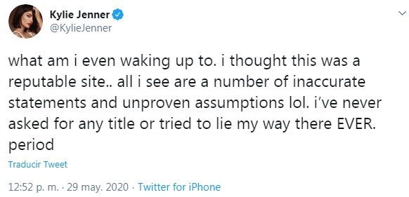 Luego de esta publicación, los representantes de la hermana de Kim Kardashian, enviaron un comunicado negando que Kylie haya mentido. “Las acusaciones de que los Jenner, y / o sus contadores, falsificaron declaraciones de impuestos y luego mintieron sobre sus ingresos de 2016 durante los últimos cuatro años, son absolutamente falsas”, dice el escrito.