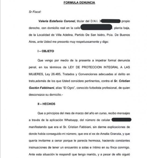 En este sentido, Valeria Estefanía Coronel, denunció que el futbolista Cristian El Ogro Fabbiani "quería invitarla a cenar porque era hermosa" y tenía la intención de "tener un encuentro a solas e íntimo".