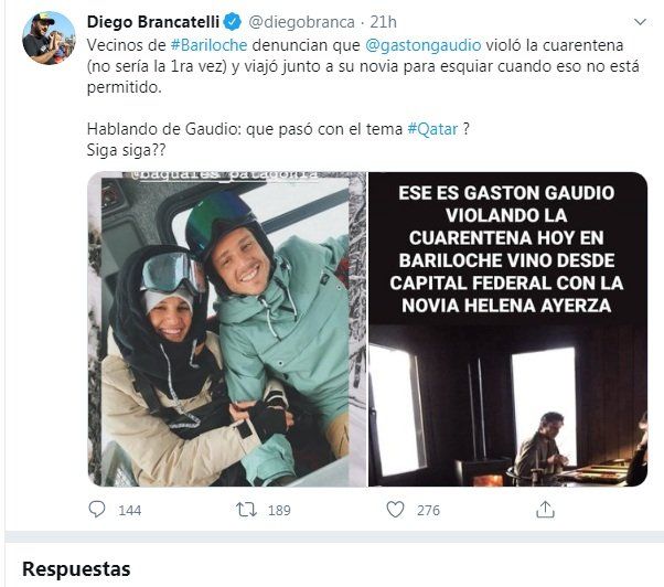 “Vecinos de Bariloche denuncian que Gastón Gaudio violó la cuarentena y no sería la primera vez. Viajó junto a su novia para esquiar cuando eso no está permitido. Hablando de Gaudio: que pasó con el tema Qatar? Siga siga?”, escribió Diego a través de su cuenta en Twitter. Acompaño además el tuit con una foto de la pareja en los medios de elevación y se conoció que también fueron vistos en un importante restaurante de la montaña.
