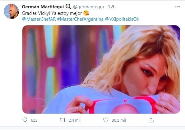 A través de su cuenta de Twitter, Germán Martitegui reaccionó luego de ver el gesto de Vicky Xipolitakis en Masterchef Celebrity. La concursante se presentó a la última gala del certamen de cocina usando una remera con la cara del chef con el fin de recordarlo. Cabe destacar que Martitegui está ausente al dar positivo a coronavirus.