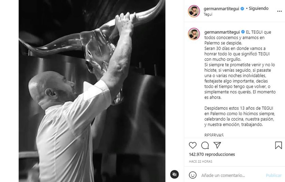 A través de su cuenta en la red social Instagram el reconocido chef y jurado de Masterchef Celebrity Argentina Germán Martitegui informó que su restaurante Tegui cerrará. Acompañado de una foto en el local, Martitegui expresó: “El Tegui que todos conocemos y amamos en Palermo se despide”.