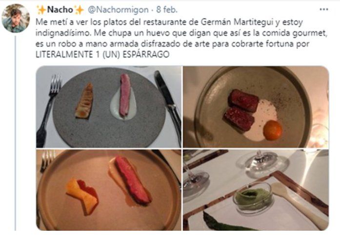 El usuario muy molestó con el restaurante de Germán Martitegui escribió: “Me metí a ver los platos del restaurante de Germán Martitegui y estoy indignadísimo. Me chupa un huevo que digan que así es la comida gourmet, es un robo a mano armada disfrazado de arte para cobrarte fortuna por literalmente un espárrago”, junto al post, la persona adjuntó cuatro fotos de cuatro platos diferentes, entre los que hay carne, pato y espárragos.