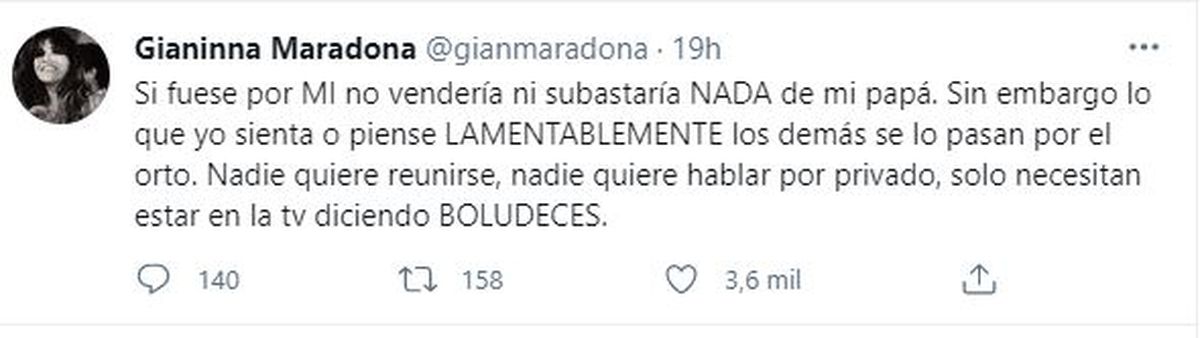 Aunque la primera vez se dijo que todos los hijos de Diego Maradona estaban de acuerdo, Gianinna Maradona dijo que la subasta no sería su primera opción: “Si fuese por mí no vendería ni subastaría nada de mi papá. Sin embargo, lo que yo sienta o piense lamentablemente los demás se lo pasan por el orto. Nadie quiere reunirse, nadie quiere hablar por privado. Solo necesitan estar en la televisión diciendo boludeces”.