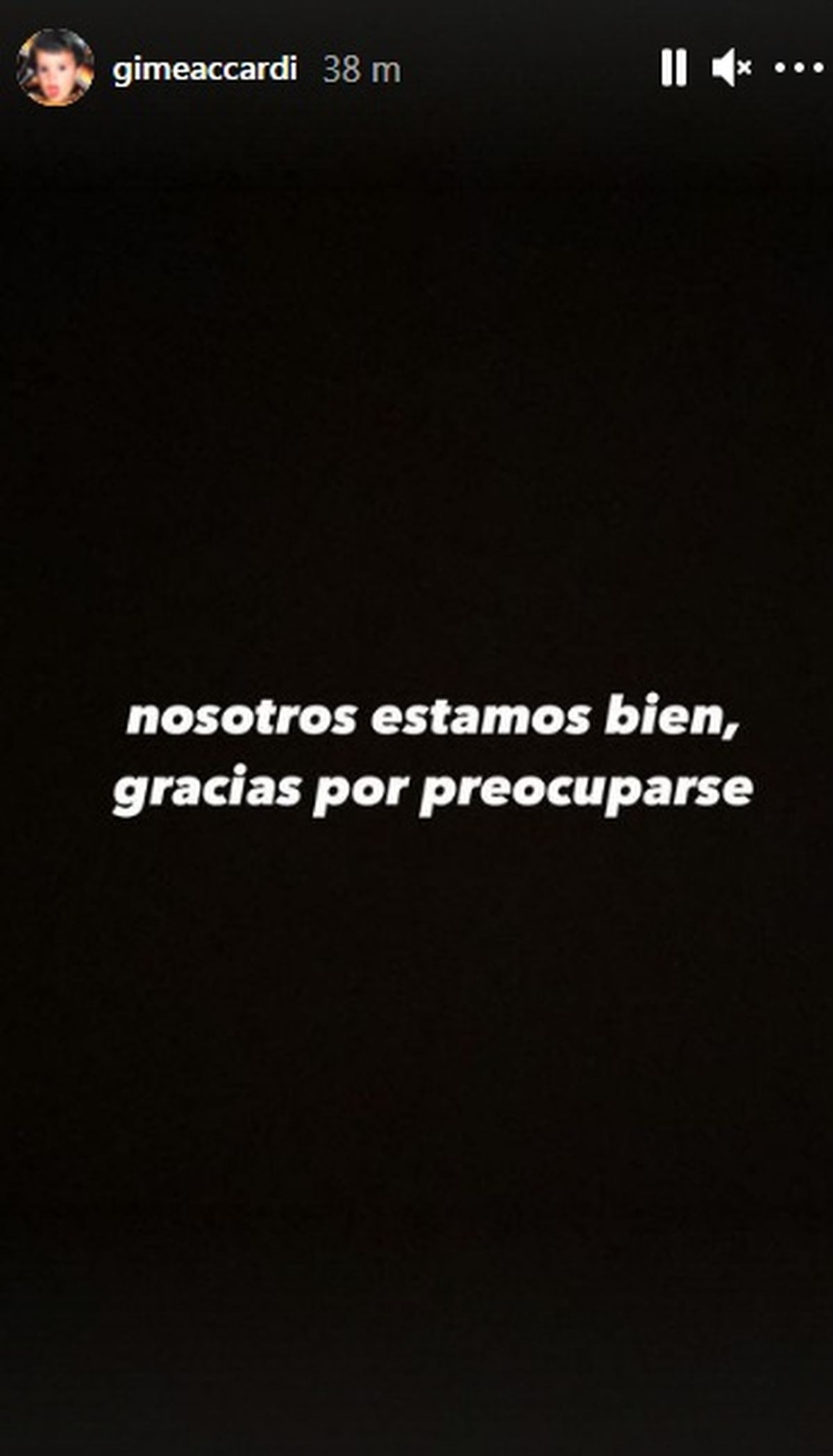 Por su parte, en Instagram, Gimena subió una historia para tranquilizar a sus seguidores quienes se encontraban muy preocupados. " Nosotros estamos bien, gracias por preocuparse", escribió en la red social. Según dieron a conocer, la pareja está en estado de shock por lo ocurrido.