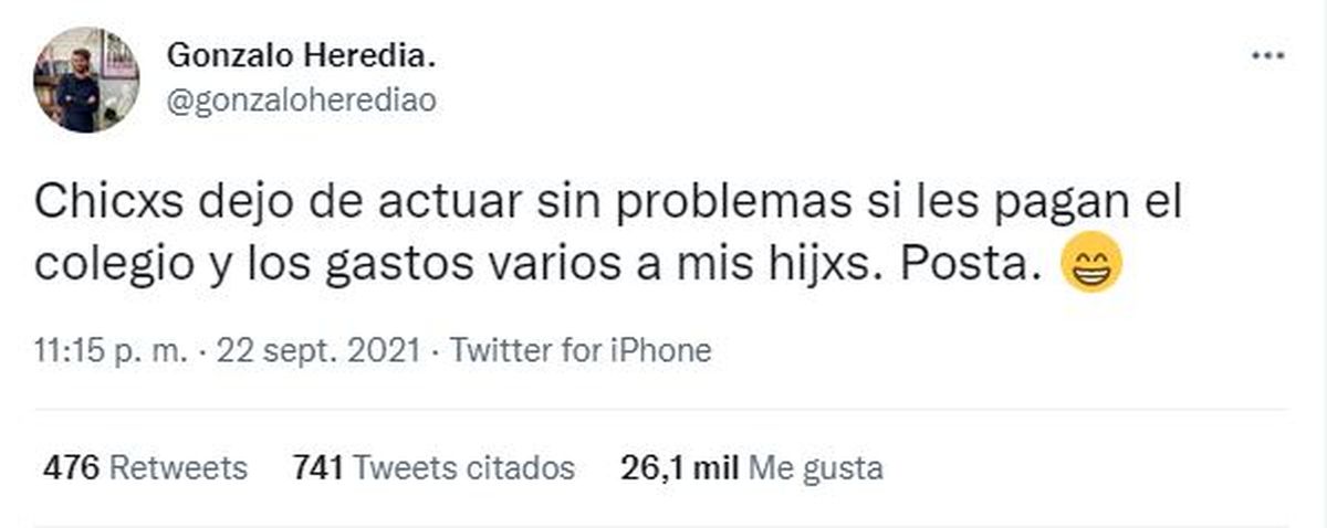 Pero como todo tiene su límite y cansado de las críticas, el actor Gonzalo Heredia decidió contestar a las burlas de sus detractores a través del mismo medio por donde le atacaron, es decir las redes sociales. Desde su cuenta Twitter Heredia trinó: “Chicxs, dejo de actuar sin problemas si les pagan el colegio y los gastos varios a mis hijxs. Posta”. Es bueno destacar que el posteo de Heredia obtuvo más de 17 mil likes.