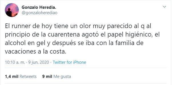 "El runner de hoy tiene un olor muy parecido al que al principio de la cuarentena agotó el papel higiénico, el alcohol en gel y después se iba con la familia de vacaciones a la costa", expresó el actor, haciendo referencia a los ciudadanos que hace unos meses decidieron comprar una gran cantidad de productos esenciales para la higiene, sacándole la posibilidad a otras personas de también poder adquirirlos.