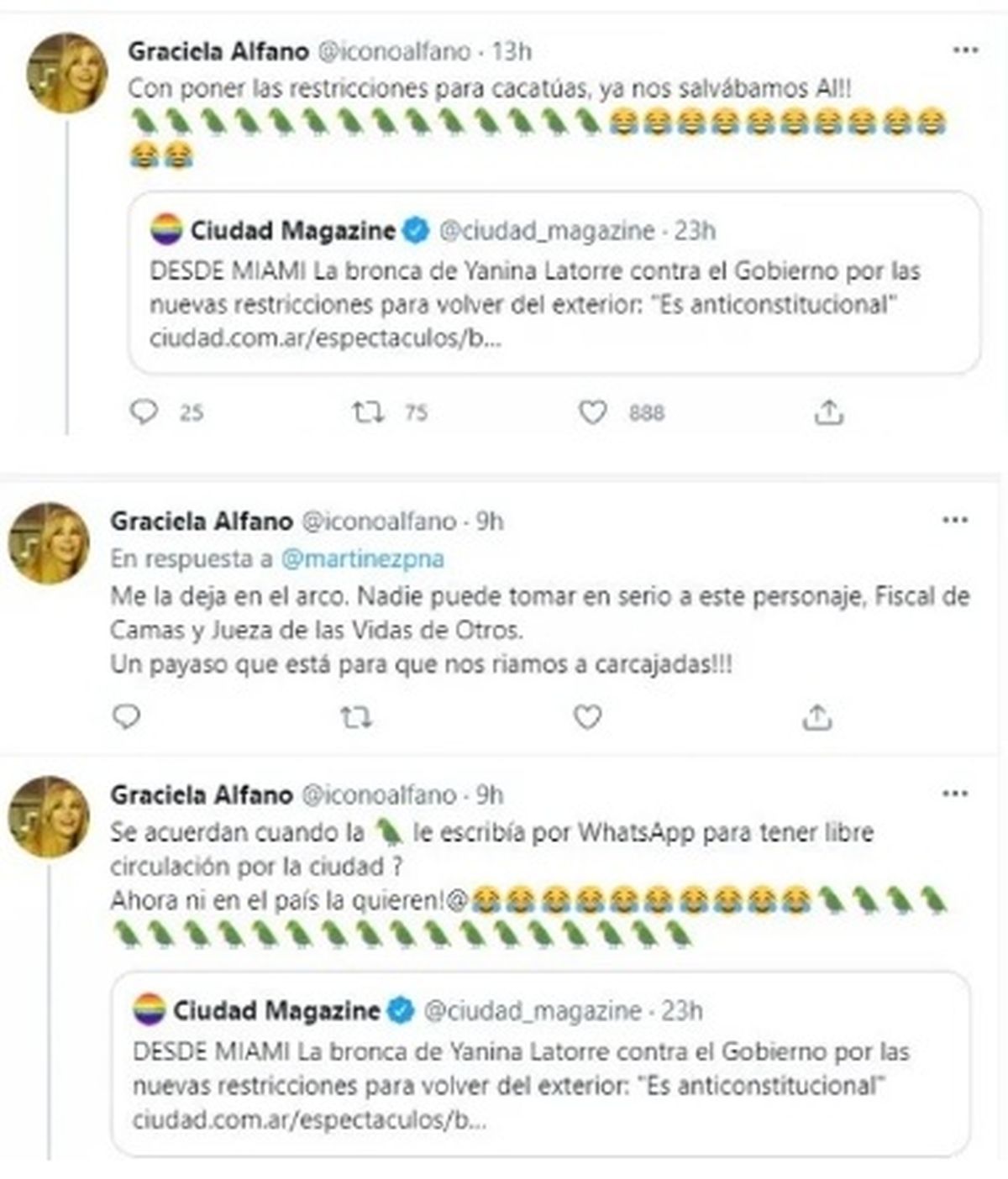 "La bronca de Yanina Latorre contra el Gobierno por las nuevas restricciones para volver del exterior: 'Es anticonstitucional'", escribió en una noticia que replicó Alfano de Ciudad. "¿Se acuerdan cuando la cacatúa le escribía por WhatsApp (a Alberto Fernández) para tener libre circulación por la ciudad? Ahora ni en el país la quieren. Nadie puede tomar en serio a este personaje, fiscal de camas y jueza de las vidas de otros... Un payaso que está para que nos riamos a carcajadas", escribió en Twitter.