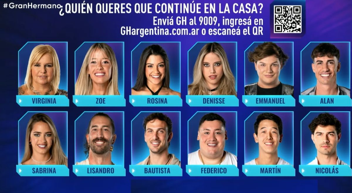 Los jugadores que quedaron en placa de eliminación en 'Gran Hermano', y se enfrentan al voto positivo son los siguientes: Virginia, Zoe, Rosina, Denisse, Emmanuel, Alan, Sabrina, Lisandro, Bautista, Federico, Martín y Nicolás.