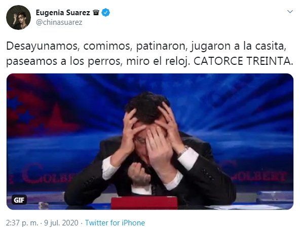 El mensaje lo compartió con una especia de meme donde aparece un hombre que se tapa el rostro con manos de más. Eugenia expresó su frustración y la situación agotadora entre el cuidado de las nenas: calses virtuales, juegos, tareas y su avanzado embarazo. En la publicación, sus seguidores se compadecieron de ellas y compartieron también su experencia. "Estoy igual, no duermen siesta? estoy en esa creo", "Te entiendo no se pasa más la hora", decían algunos mensajes de los internautas.
