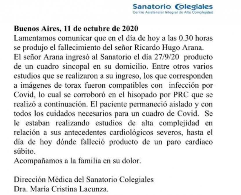 Finalmente, en el texto del Sanatorio Colegiales revelaron la causa de la muerte de Hugo Arana: "... falleció producto de un paro cardíaco súbito".