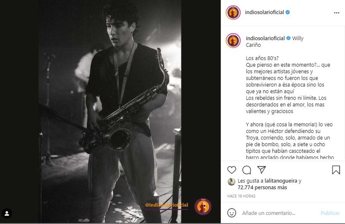 El cantante argentino Carlos El Indio Solari usó sus redes sociales para despedirse de su amigo y colega Willy Crook, quien falleció a los 55 años. Solari y Crook fueron compañeros en la banda de Patricio Rey y sus redonditos de ricota. Junto a una imagen el artista escribió: