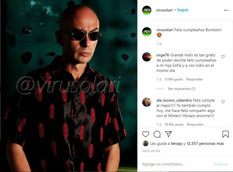 En el mensaje que escribió la esposa del Indio Solari se puede leer: “¡Feliz cumpleaños, bombón!”. Virulana -tal como la apodó el propio Solari, acompañó el posteo con una foto del cantante donde se lo ve con sus clásicos anteojos de sol con marco redondo.