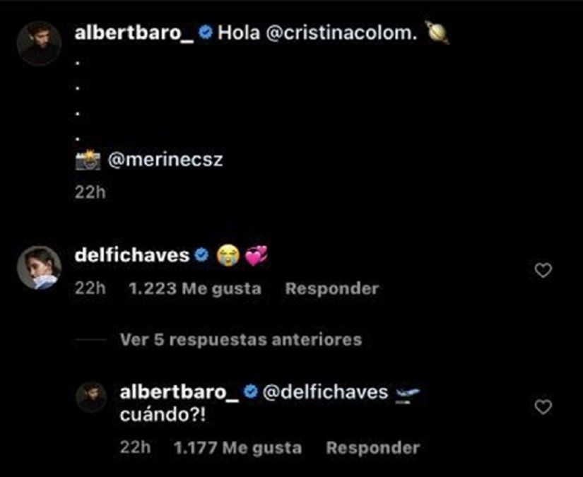 Delfi Chaves le dejó dos emojis, uno de carita con lágrimas y otro de corazones. Por su parte, Albert Baró le contestó como preguntándole cuándo volaba para reencontrarse, luego de tanto tiempo sin verse. Mirá a continuación los comentarios, y la publicación del actor.