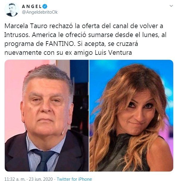 El periodista Ángel de Brito, informó a través de su cuenta en Twitter, que la panelista habría rechazado la oferta del canal de volver al programa. Según de Brito, América le ofreció a cambio sumarse a Fantino. "Marcela Tauro rechazó la oferta del canal de volver a Intrusos. America le ofreció sumarse desde el lunes, al programa de FANTINO. Si acepta, se cruzará nuevamente con su ex amigo Luis Ventura", escribió el conductor de "Los Ángeles de la mañana".
