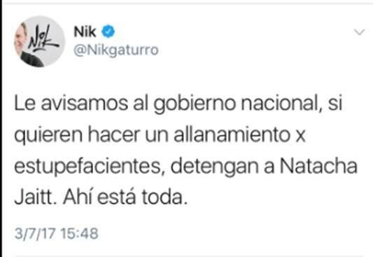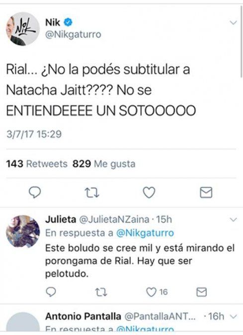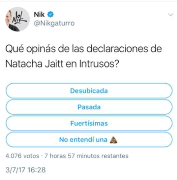 Sin dudas sus palabras más fuertes son para Natacha Jaitt y su participación en "Intrusos", son letales contra la mediática conductora, "Rial... ¿No la podés subtitular a Natacha Jaitt?? No se ENTIENDEEE UN SOTOOO", "Le avisamos al gobieron nacional, si quieren hacer un allanamiento x estupefacientes, detengan a Natacha Jaitt. Ahí está toda." y por último mete una encuesta también muy mala leche "Qué opinas de las denuncias de Natacha Jaitt en Intrusos?: Desubicada - Pasada- Fuertísimas - No entendí una mierda"
