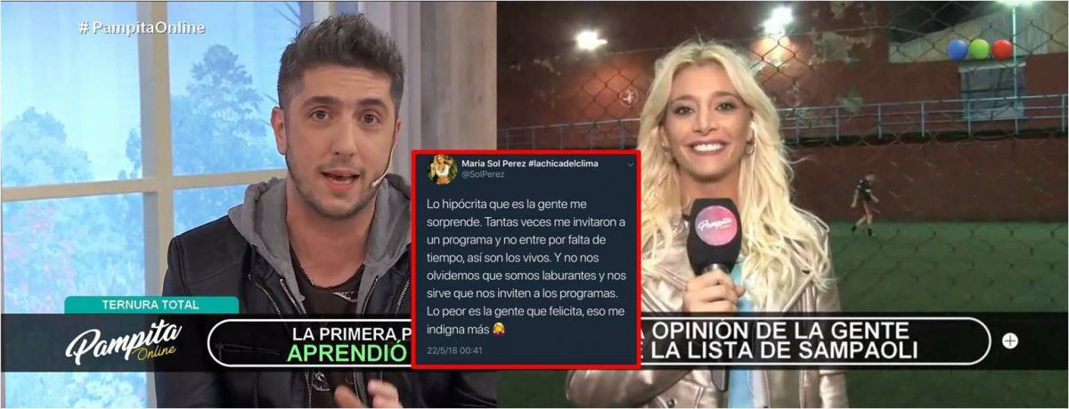 Pasadas varias horas del conflicto, Sol Pérez tomó claro partido a favor de Pampita y le dedicó un mensaje casi directo al cómico desde su cuenta de twitter: "Lo hiócrita que es la gente me sorprende. Tantas veces me invitaron a un programa y no salí por falta de tiempo...".