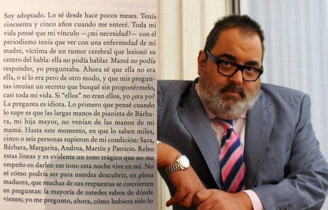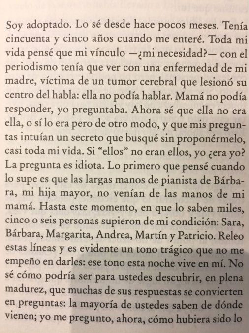 "Soy adoptado. Lo se desde hace pocos meses. Tenía cincuenta y cinco años cuando me enteré. Toda mi vida pensé que mi vínculo -¿mi necesidad?- con el periodismo tenía que ver con una enfermedad de mi madre, víctima de un tumor cerebral que lesionó su centro del habla: ella no podía hablar. Mamá no podía responder, yo preguntaba. Ahora se que ella no era ella, o sí lo era pero de otro modo, y que mis preguntas intuían un secreto que busqué sin proponérmelo, casi toda mi vida. Si "ellos" no eran ellos, yo ¿era yo?.