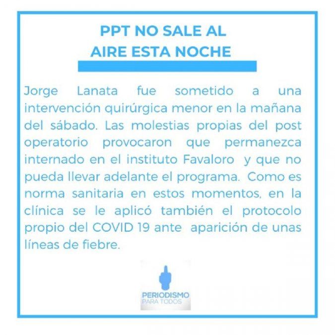 La producción del programa Periodismo Para Todos, trasmitido los domingos por El Trece, publicó un comunicado sobre la ausencia de Jorge Lanata. A continuación:
