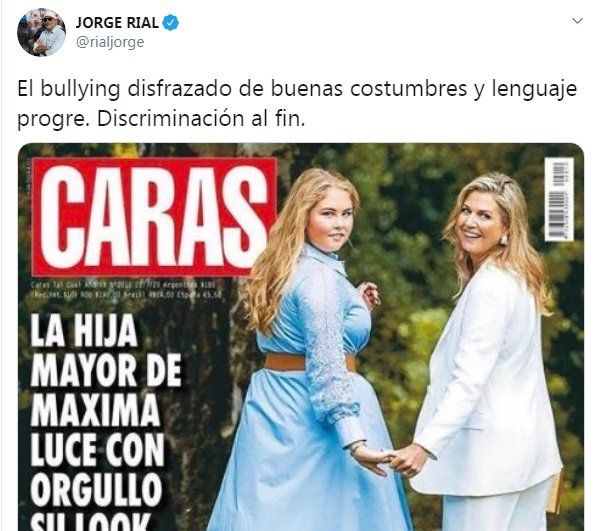 El conductor de "Intrusos", Jorge Rial, criticó duramente la tapa de la última edición de la revista Caras que tiene como protagonista a la hija de la reina Máxima de Holanda. En transmisión en vivo, el periodista alegó que las personas con sobrepeso no "sienten orgullo por ellos mismos pero hay quienes lo afrontan con dignidad", este comentario desató las críticas hacia el conductor a través de las redes sociales.
