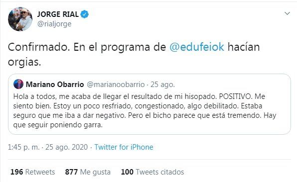 “Hola a todos, me acaba de llegar el resultado de mi hisopado. POSITIVO. Me siento bien. Estoy un poco resfriado, congestionado, algo debilitado. Estaba seguro que me iba a dar negativo. Pero el bicho parece que está tremendo. Hay que seguir poniendo garra”, fue el tweet del periodista, que recibió la inmediata respuesta sin filtro del conductor de América. “Confirmado. En el programa de @edufeiok hacían orgías”.