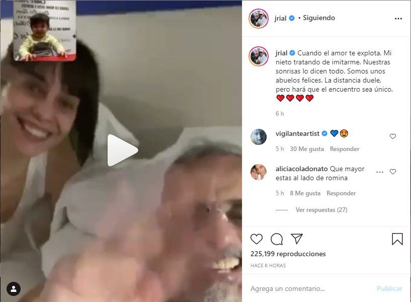 Después, cuando recuperó la compostura y todavía le duraba la felicidad, porque esa sensación reconfortante se mantiene horas y horas en el cuerpo de las personas, escribió “Cuando el amor te explota. Mi nieto tratando de imitarme. Nuestras sonrisas lo dicen todo. Somos unos abuelos felices. La distancia diuele, pero hará que el encuentro sea único“.