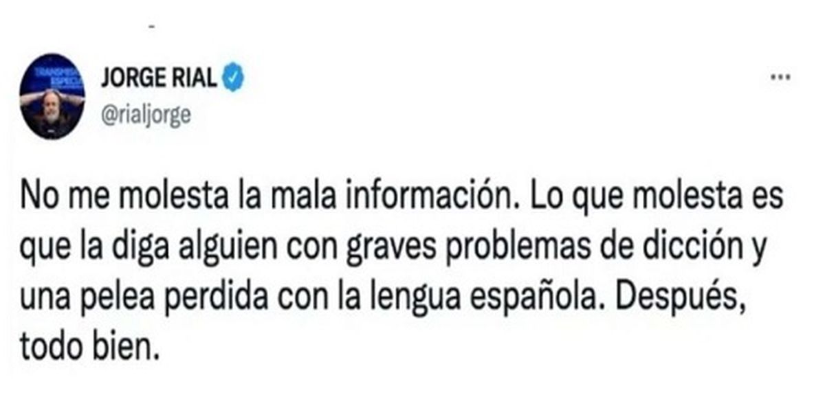 Al respecto, Marcela Tauro, habría dado su análisis sobre esta pelea y Jorge Rial no se quedó callado y le lanzó un palito en redes. "No me molesta la mala información. Lo que molesta es que la diga alguien con graves problemas de dicción y una pelea perdida con la lengua española. Después, todo bien", escribió Jorge Rial en su Twiter.