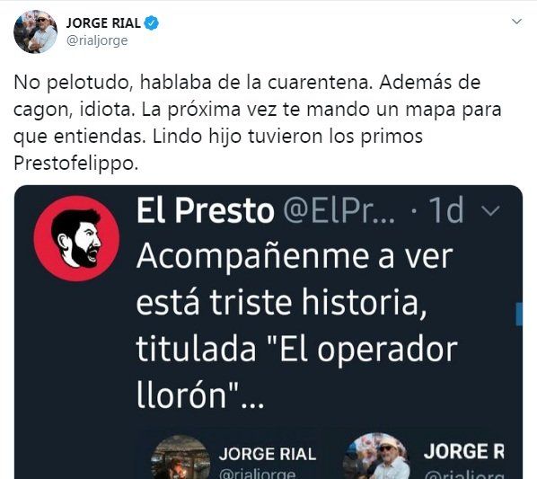 Sin embargo las cosas no se detuvieron ahí, pues Prestofelippo respondió: "Acompáñenme a ver esta triste historia titulada ‘El operador llorón'", haciendo que el conductor de "Intrusos" replicara su mensaje con un fuerte descargo en su contra: "No pelut...Hablaba de la cuarentena. Además de cag..., idio...La próxima vez te mando un mapa para que entiendas. Lindo hijo tuvieron los primos Prestofelippo".