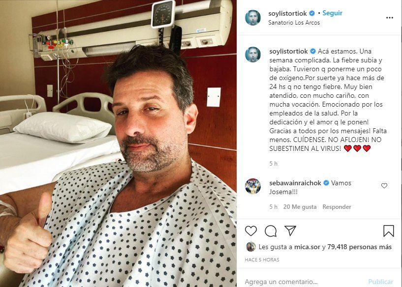 Luego de su posteo, Listorti recibió el cariño de su público: “Fuerza José”, “Que te mejores”, “Te extrañamos”, “Cuidate, que bueno que estés mejorando”, “Vamos Josema”, “Dios te bendiga, pronto vas a salir”, “Gracias a Dios y a la gente de la salud”, “Que te sanes pronto , mucha fe en nuestro Señor , nunca nos abandona”, fueron algunos de los mensajes.