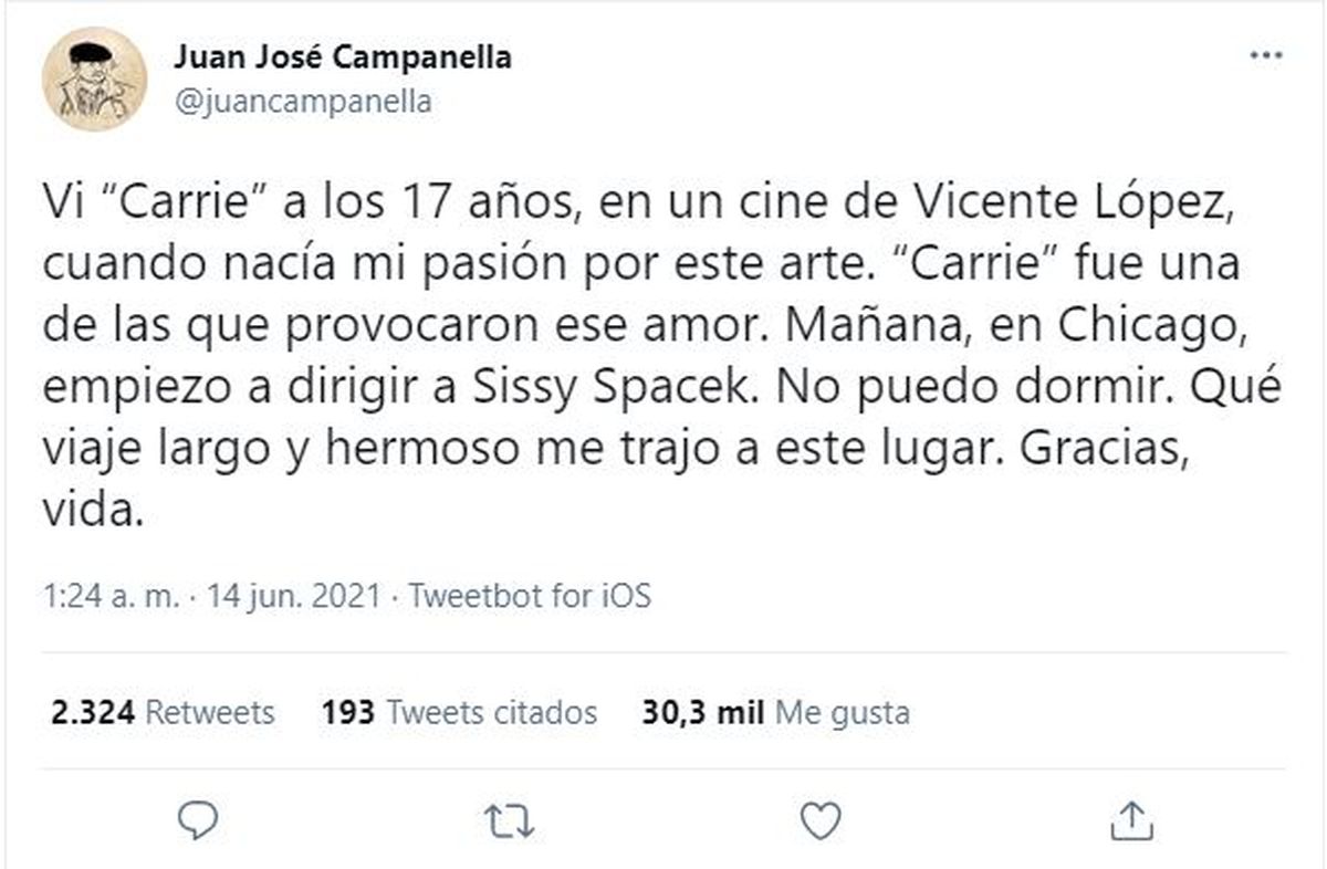 En un hilo que publicó en su cuenta de Twitter, el realizador Juan José Campanella relató que la primera vez que vio a Sissy Spacek fue cuando él tenía 17 años, y vio en un cine de Vicente López la película Carrie: “Carrie fue una de las (producciones) que provocaron ese amor. Mañana, en Chicago, empiezo a dirigir a Sissy Spacek. No puedo dormir. Qué viaje largo y hermoso me trajo a este lugar. Gracias, vida”, compartió el director.