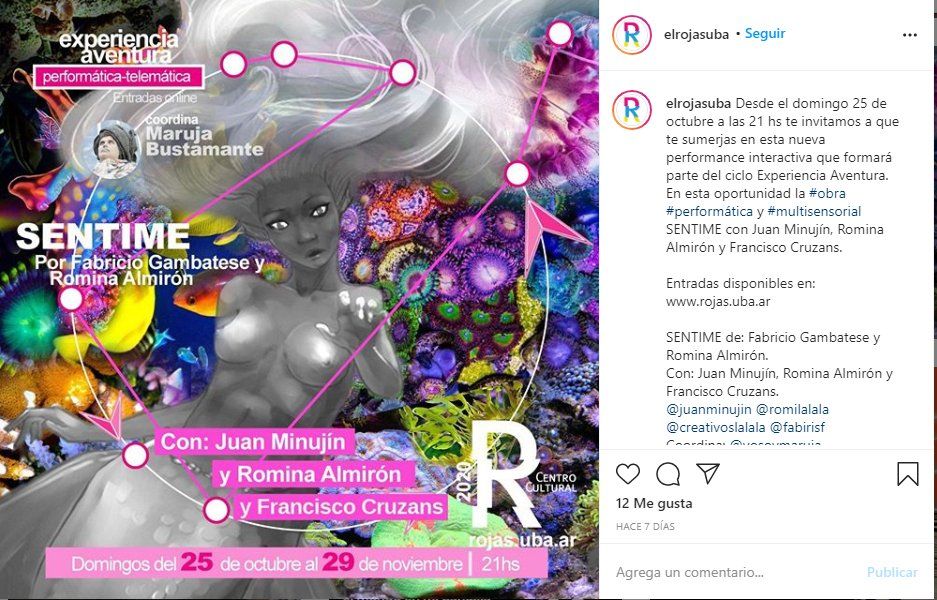 Además del ciclo performático Aventura, el Centro Cultural Rojas continúa ofreciendo cursos online orientados a todas las edades y diferentes actividades culturales en su plataforma educativa www.rojas.uba.ar. También registros audiovisuales de obras de teatro y danza montadas en la sala Batato Barea y otros espacios del Centro Cultural. Y en el marco de EscenaLab, desde el 5 de noviembre estará disponible Pausa, "una inmersión audiovisual" que combina música hecha con instrumentos acústicos y electrónicos, sonidos de la naturaleza e imágenes, a cargo de Guillermo Cardozo Ocampo, Ciro Cavalotti, Quique Condomí y Wili Peloche.