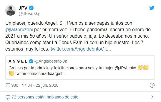 Un placer, querido Angel. Siiii! Vamos a ser papás juntos con @lalabruzoni por primera vez. El bebé pandemial nacerá en enero de 2021 a mis 50 años. Un señor paduelo, jaja. Lo deseábamos mucho. Queríamos completar La Bonus Familia con un hijo nuestro. Los 7 estamos muy felices.