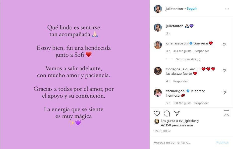 A dos días del ataque, Julieta Antón, quien afortunadamente ya está fuera de peligro, uso su cuenta en la red social Instagram para agradecer a las personas que se preocuparon por ella: "Qué lindo es sentirse tan acompañada. Estoy bien, fui una bendecida junto a Sofi" escribió la profesora de danza. Además agregó: "Vamos a salir adelante con mucho amor y paciencia. Gracias a todxs por el amor, por el apoyo y su contención, la energía que se siente es muy mágica", concluyó la también bailarina de ShowMatch.