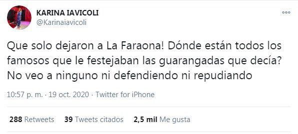 “¡Qué solo dejaron a La Faraona! ¿Dónde están todos los famosos que le festejaban las guarangadas que decía? No veo a ninguno ni defendiendo ni repudiando”, dijo ella. Cabe recalcar que todo comenzó cuando días atrás se viralizaron repudiables tweets de Cirio haciendo referencia a menores y el tema llegó a la Justicia donde fue denunciado por apología de la pedofilia en el Juzgado Nacional.
