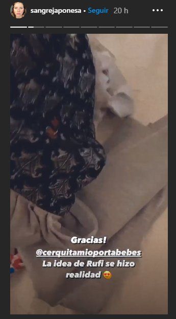 En las últimas horas, La China Suárez compartió en sus historias un regalo que le hizo llegar una marca, se trata de un “porta bebé” e indicó que Rufina le pidió uno que fuera adaptado a su tamaño para poder llevar ella a su hermanito sobre su pecho.