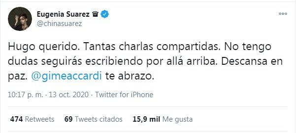 “Hugo querido. Tantas charlas compartidas. No tengo dudas seguirás escribiendo por allá arriba. Descansa en paz. @gimeaccardi te abrazo”, escribió la pareja de Benjamín Vicuña en la red social. Cabe recalcar que La China Suárez y Gimena Accardi estuvieron enemistadas durante unos años, sin embargo hace poco se mostraron nuevamente cercanas.