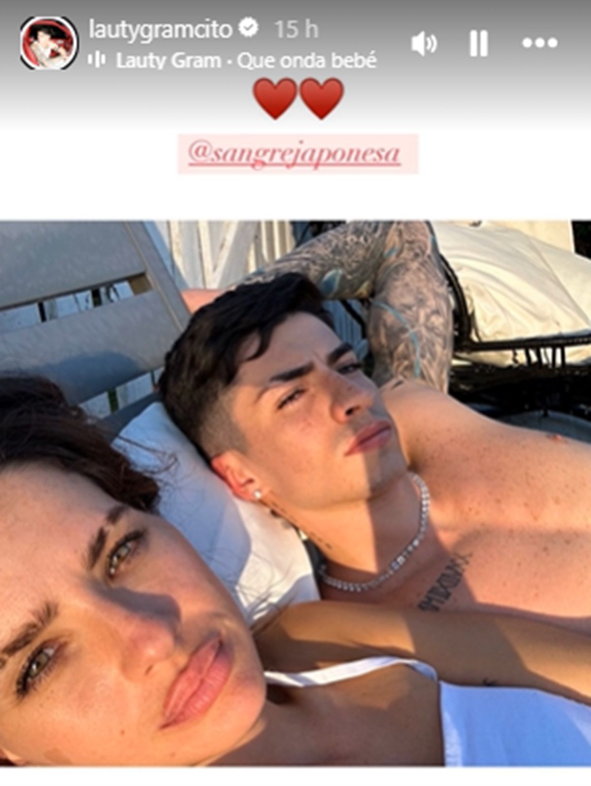En las últimas horas, el músico Lauty Gram y la actriz China Suárez sorprendieron a todos sus seguidores al mostrarse juntos en una foto íntima. La pareja estaba tomando sol y decidieron tomarse una selfie juntos. El artista no dudó en compartir una historia en Instagram, y agregó dos corazones rojos, blanqueando su amor por la también cantante.