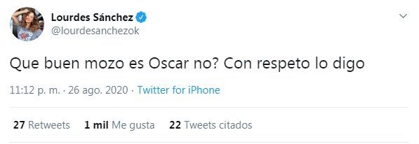 A través de su cuenta de Twitter, donde semana a semana, Lourdes comenta sus opiniones sobre el certamen de canto, esta vez usó la red social para lanzarle un piropo al productor musical. "Qué buenmozo es Oscar, ¿no? Con respeto lo digo", soltó sin filtro, y de inmediato, su pareja respondió tajante al tweet: "Ah bueno..." y lejos de quedarse callada, la ex participante del Bailando lanzó: "Pero a vos Pampita también te parece una bomba...".
